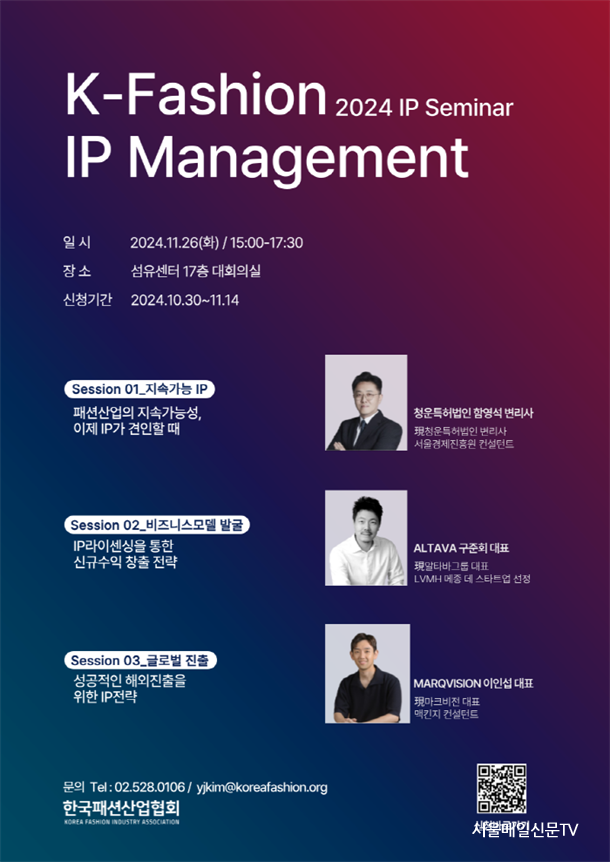 輭 / ѱмǻȸ 11 26(ȭ) 3ú 5 30б ī̺ 17 K-FASHION IP ŴƮ ̳ Ѵ. ֱ Ŀӽ Ȱȭ K-м 귣 (IP) ħ 鼭, 귣 ġ ͼ ȭǰ ִ Ȳ̴.